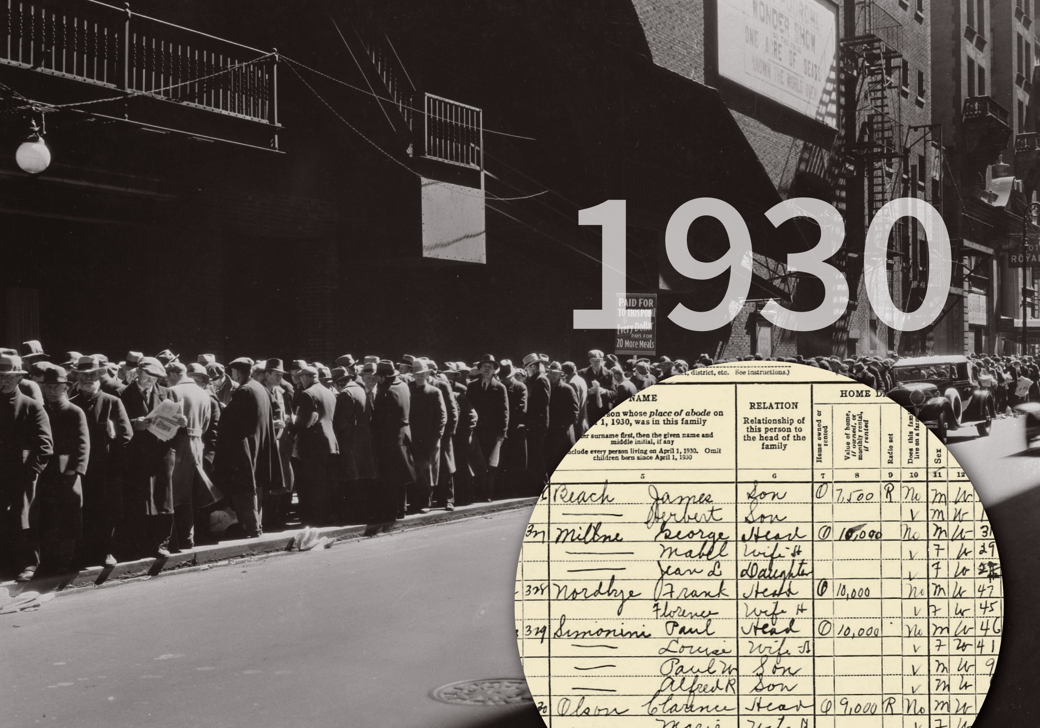 El Censo de 1930 puede mostrarle dónde se encontraba su familia al inicio de la Gran Depresión, ofreciendo una ventana a sus vidas en un momento complejo. La década que siguió vería desafíos económicos globales, la condena del gánster Al Capone, el Dust Bowl en las Grandes Llanuras y el debut de los cómics de Superman. Miles de proyectos de infraestructura, incluyendo la represa Hoover y el Aeropuerto LaGuardia, pusieron a los estadounidenses de vuelta al trabajo como parte del New Deal del presidente Franklin Delano Roosevelt. Sin embargo, a medida que la Segunda Guerra Mundial se gestaba en Europa, había más dificultades por venir.